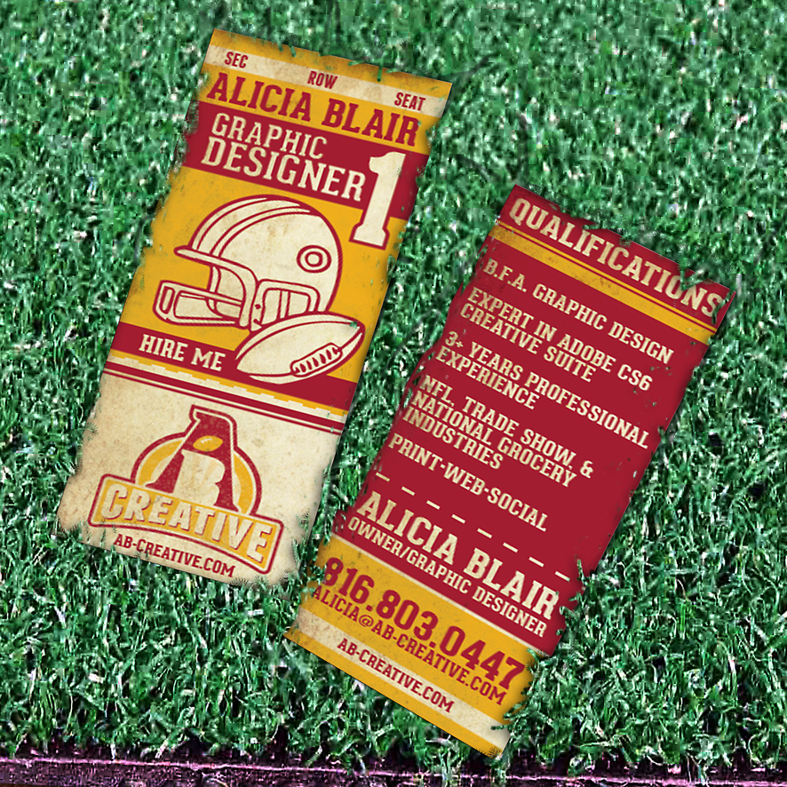 I love football, and sports design, so I went along with the retro theme of my logo and created a business card with a tear-off stub like a game day ticket. The stub can be placed in the business slot of a wallet.